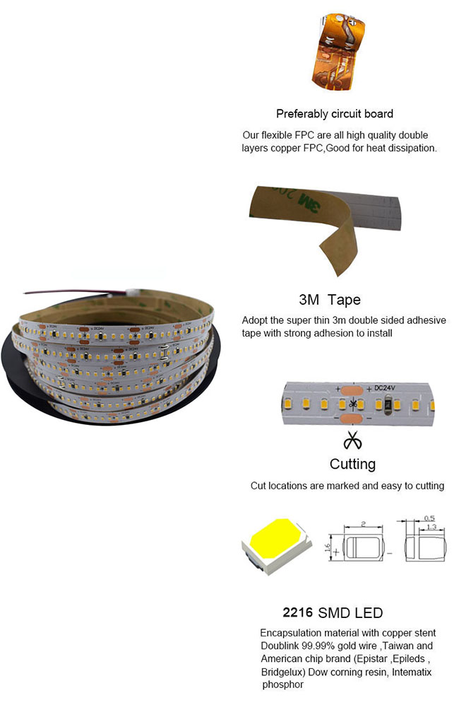 2216SMD Led Strip Lamp High CRI>90 DC24V 2216 Flexible Led Strip Light 120~420Leds/m 3000K/4500K/6000K